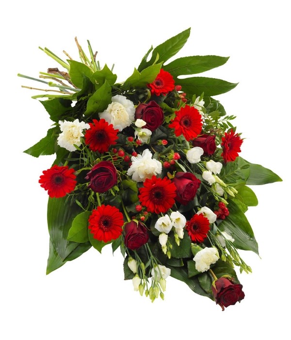 A red & white funeral sheaf made with blooms such as carnations, gerberas, roses, eustomas, and decorative fillers, meticulously crafted to convey heartfelt sympathy and honour the memory of a loved one. Red symbolises love, while white represents purity, reverence, and remembrance. Together, these colours create a meaningful tribute that expresses both admiration and condolence. A beautiful gesture & a great price - this beautiful red & white funeral sheaf delivers both.
