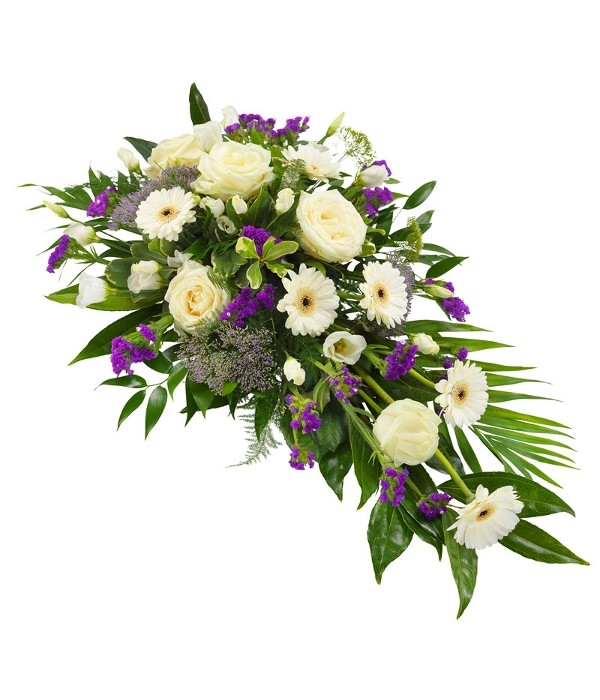 Send your personal greeting with this elegant stretcher decoration, featuring a harmonious blend of white and purple flowers. It typically contains germini, roses, and eustoma, complemented by decorative greenery. The combination of white and purple tones creates a sophisticated and heartfelt arrangement, perfect for any special occasion. This beautifully designed decoration offers great value, ensuring your thoughtful gesture is both elegant and affordable.